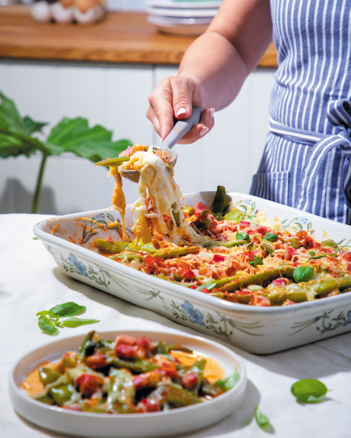 - Αδειάζουμε τα φασολάκια με τη σάλτσα τους σε βαθύ ταψί και τα ανακατεύουμε με το ζαμπόν, τον βασιλικό και τη μισή ποσότητα τυριών.