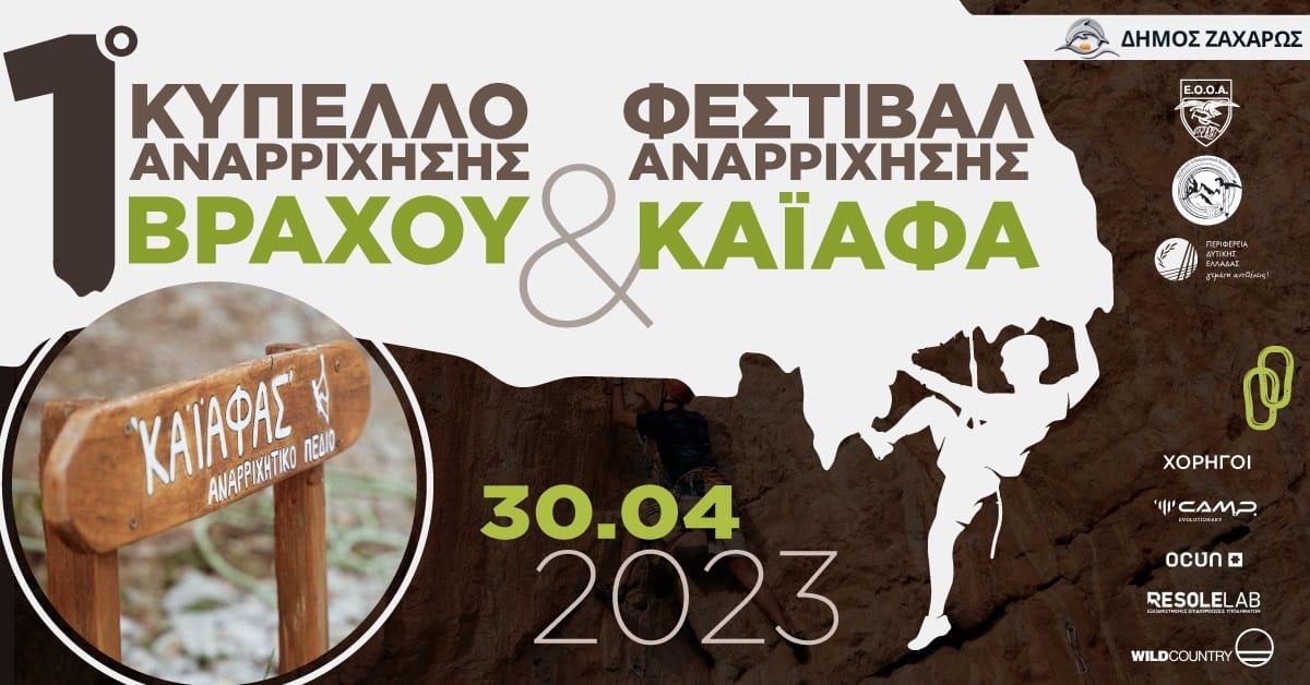Το τριήμερο της Πρωτομαγιάς (29/4/2023-1/5/2023) θα διεξαχθεί, στο Αναρριχητικό Πεδίο Καϊάφα, το Φεστιβάλ Αναρρίχησης Καϊάφα και το 1ο Κύπελλο Αναρρίχησης Βράχου, που διοργανώνει η Ορειβατική-Αναρριχητική Λέσχη Πύργου και η Ελληνική Ομοσπονδία Ορειβασίας-Αναρρίχησης, σε συνδιοργάνωση του Δήμου Ζαχάρως και της Περιφέρειας Δυτικής Ελλάδας.