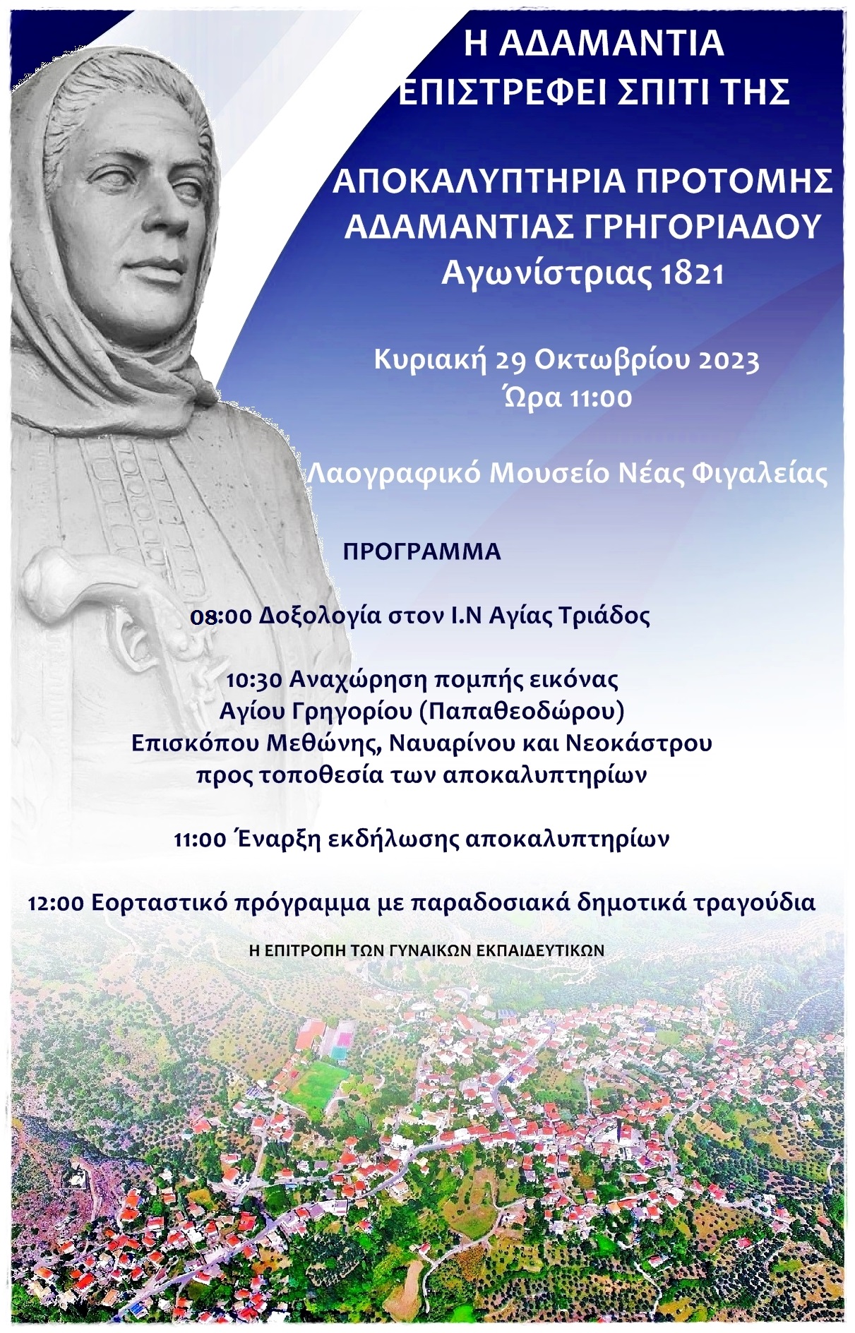 Μετά από σχεδόν 200 χρόνια από την έναρξη της ελληνικής επανάστασης επιστρέφει στο τόπο καταγωγής της για να τιμηθεί στο μέγιστο βαθμό η αγωνίστρια και λαμπρή γυναικεία παρουσία του 1821 Αδαμαντία Γρηγοριάδου.