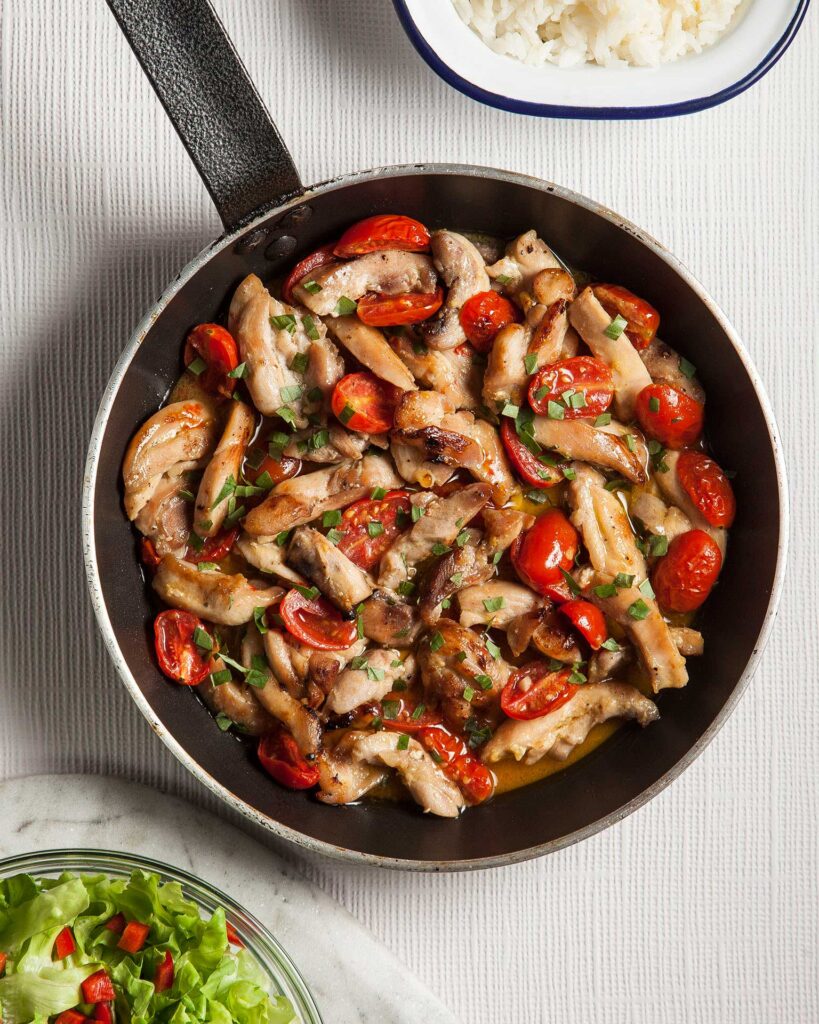 - Ανακατεύουμε απαλά, σκορπίζουμε το βασιλικό και μαγειρεύουμε για άλλα 5 λεπτά, μέχρι να μελώσουν τα ντοματάκια και να γίνει το κοτόπουλο.