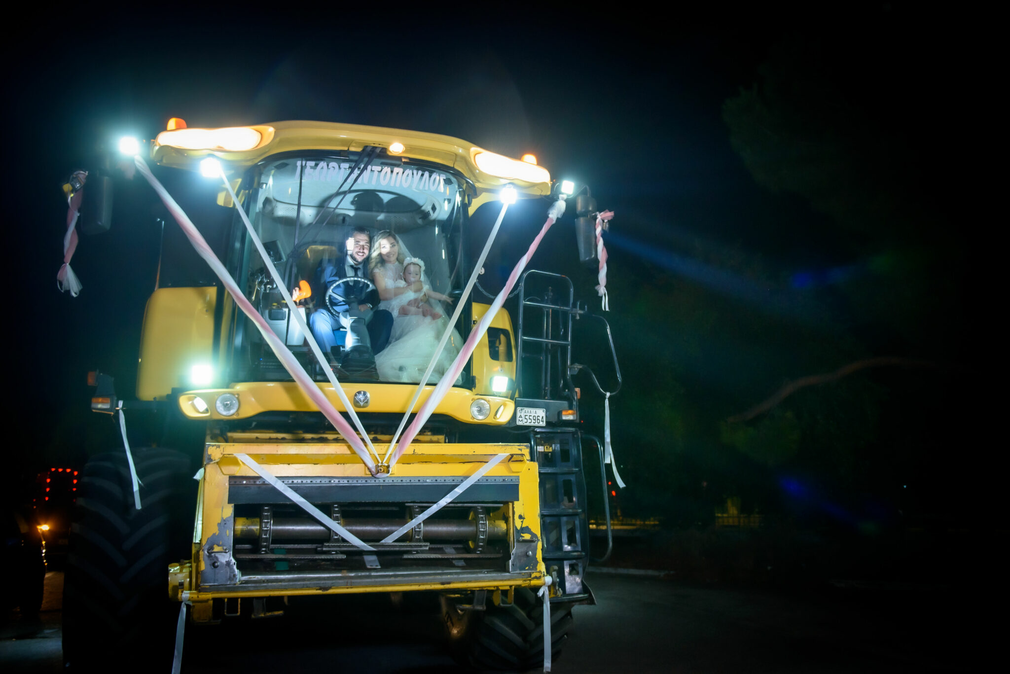 Η νύφη ξεκίνησε με την πομπή των συγγενών από το χωριό Ωλενη του νομού Ηλείας , Ενώ ο γαμπρός ξεκίνησε με πομπή αγροτικών μηχανημάτων και συγγενών από την Χαλανδρίτσα.