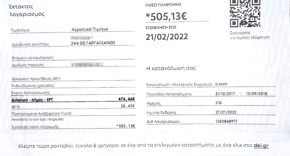 Σε αγροτικό τιμολόγιο επιβλήθηκε το τέλος 476,66 ευρώ υπέρ ΕΡΤ, Δήμος…