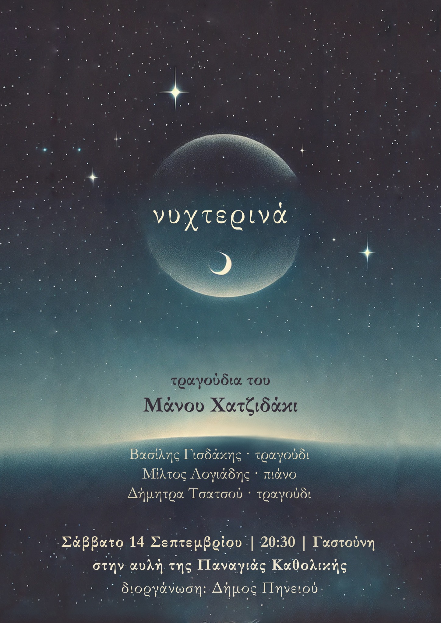 Μια μαγική συναυλία κάτω από τον έναστρο ουρανό της Ηλείας πρόκειται να απολαύσουν το βράδυ του Σαββάτου όσοι βρεθούν στον προαύλιο χώρο του εμβληματικού βυζαντινού ναού της Παναγίας Καθολικής Γαστούνης. Η εκδήλωση, που διοργανώνει ο Δήμος Πηνειού, πρόκειται να παρασύρει το κοινό σε ένα ονειρικό ταξίδι με οδηγό κάποια από τα ωραιότερα τραγούδια του σπουδαίου Μάνου Χατζιδάκι.