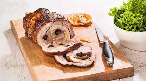 Τοποθετούμε σε πλαστική μεμβράνη το χοιρινό, ανοίγουμε το κρέας και το γεμίζουμε με την γέμιση από άκρη σε άκρη. Ρολάρουμε, κλείνουμε και στο τέλος δένουμε.