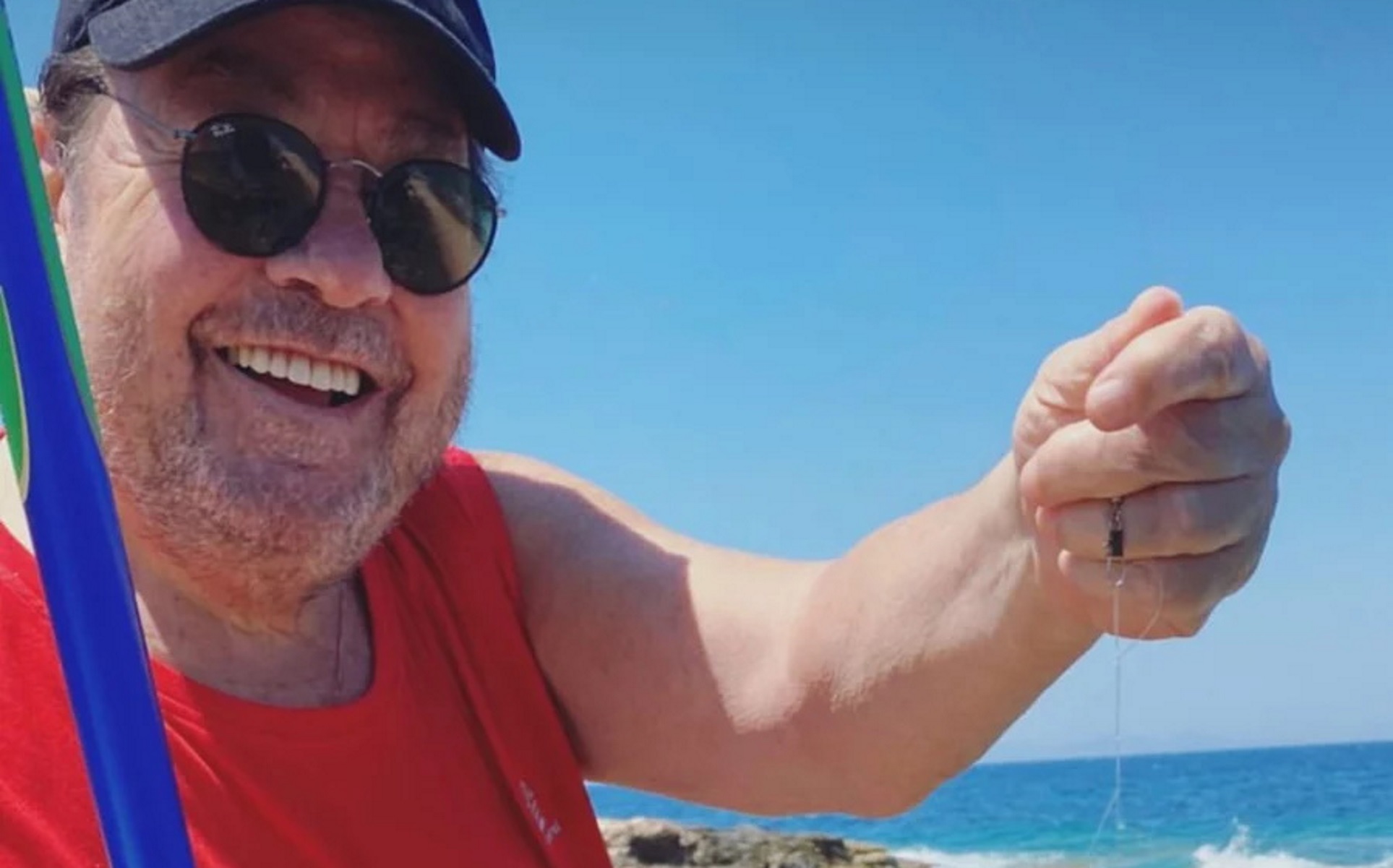 Ο τραγουδιστής φοράει σορτς με μία κοντομάνικη μπλούζα και δείχνει να είναι ενθουσιασμένος με την ψαριά του: