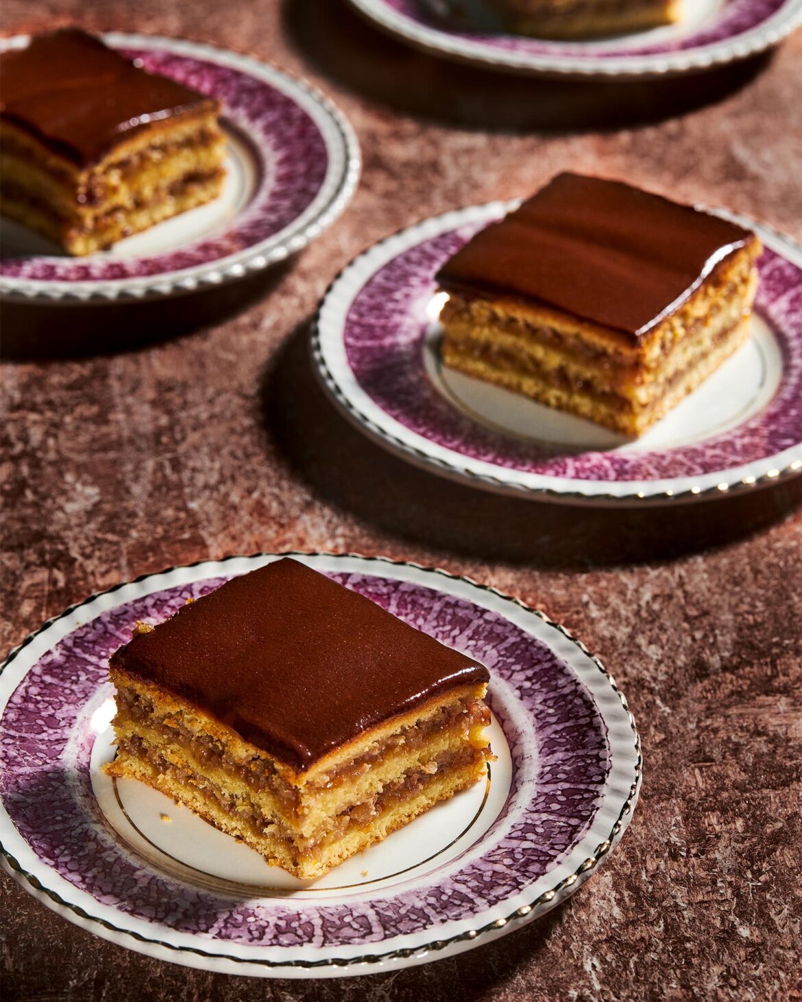 - Πασπαλίζουμε όλη την επιφάνεια με τη μισή ποσότητα από το μείγμα καρυδιού και ζάχαρης. Στρώνουμε από πάνω το δεύτερο φύλλο και επαναλαμβάνουμε τη διαδικασία με τη μαρμελάδα και το καρύδι. Καλύπτουμε με το τρίτο φύλλο.