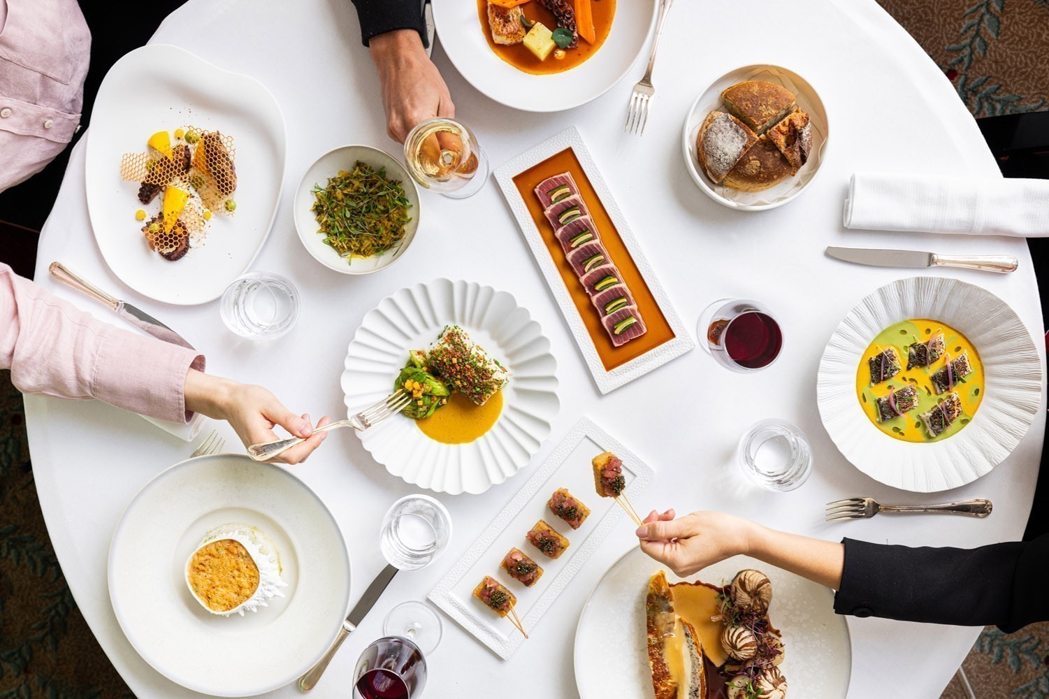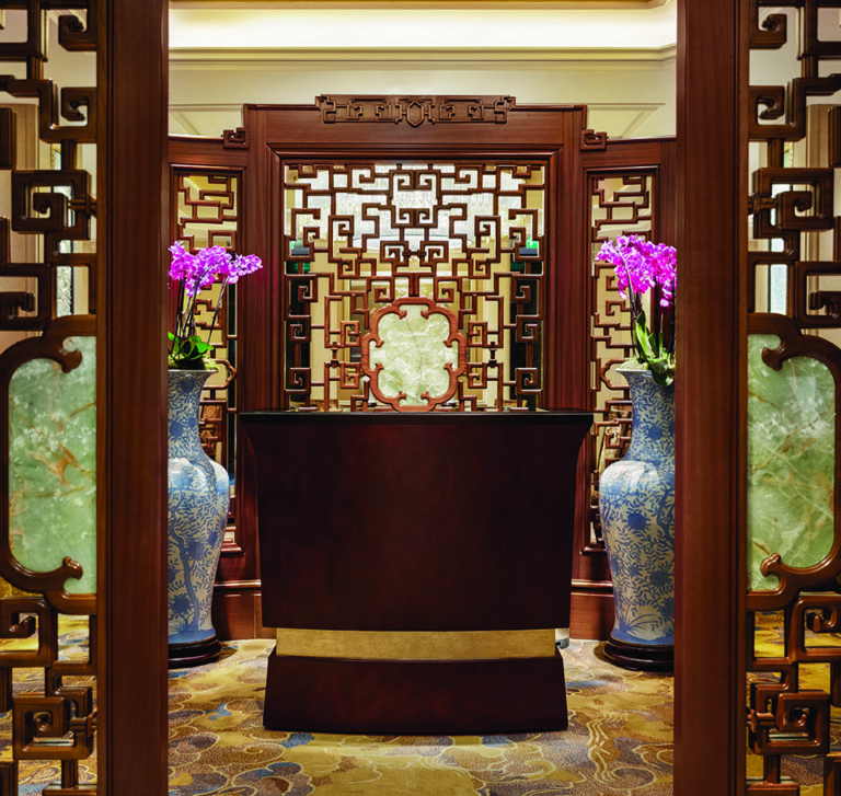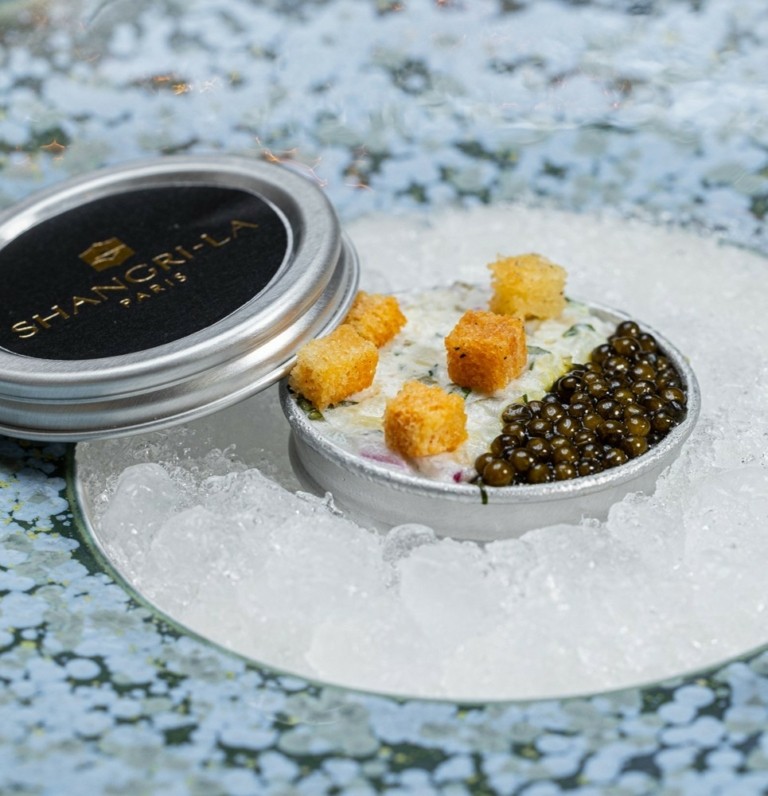 Δύο εστιατόρια, υπό την επίβλεψη του βραβευμένου με αστέρι Michelin σεφ Christophe Moret, προσφέρουν γαλλική και ασιατική κουζίνα, συμπεριλαμβανομένου του κινέζικου με αστέρι Michelin εστιατόριου Le Shang Palace μια ωδή στην καλή γεύση. Οι επισκέπτες μπορούν να απολαύσουν πρωινό, μεσημεριανό και δείπνο στην τραπεζαρία με τη γυάλινη οροφή.