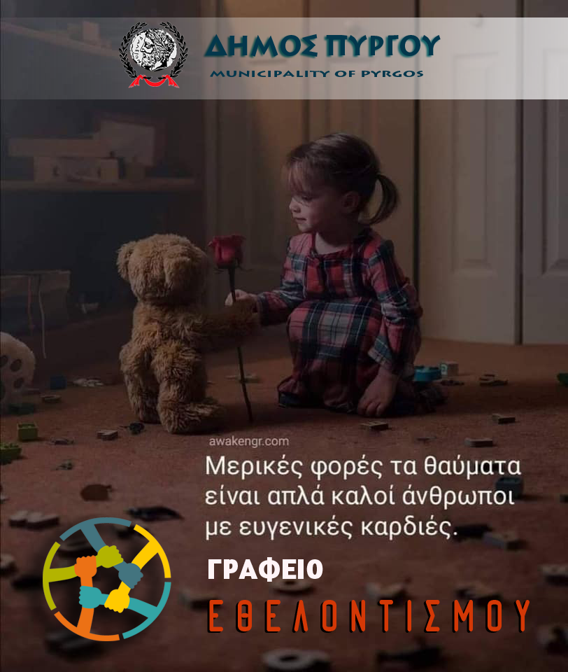 “Το γραφείο εθελοντισμού του Δήμου Πύργου και σε αυτό το lock down θα είναι δίπλα σας! Όποια οικογένεια αντιμετωπίζει προβλήματα για είδη πρώτης ανάγκης, τρόφιμα, ρουχισμό, έστω ένα πιάτο φαγητό, με διακριτικότητα μπορείτε να επικοινωνήσετε μαζί μας έστω με ένα μήνυμα και θα προσπαθήσουμε όσο είναι εφικτό να σταθούμε δίπλα σας και να βοηθήσουμε όσο πιο πολλούς συνανθρώπους μας μπορούμε!