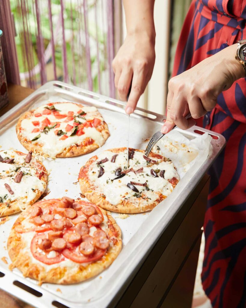 - Αφού στήσουμε τα υλικά της επιλογής μας πάνω στις πίτες, τις βάζουμε σε ένα ταψί στρωμένο με αντικολλητικό χαρτί και τις ψήνουμε σε καλά προθερμασμένο φούρνο στου 200°C για 7 λεπτά.
