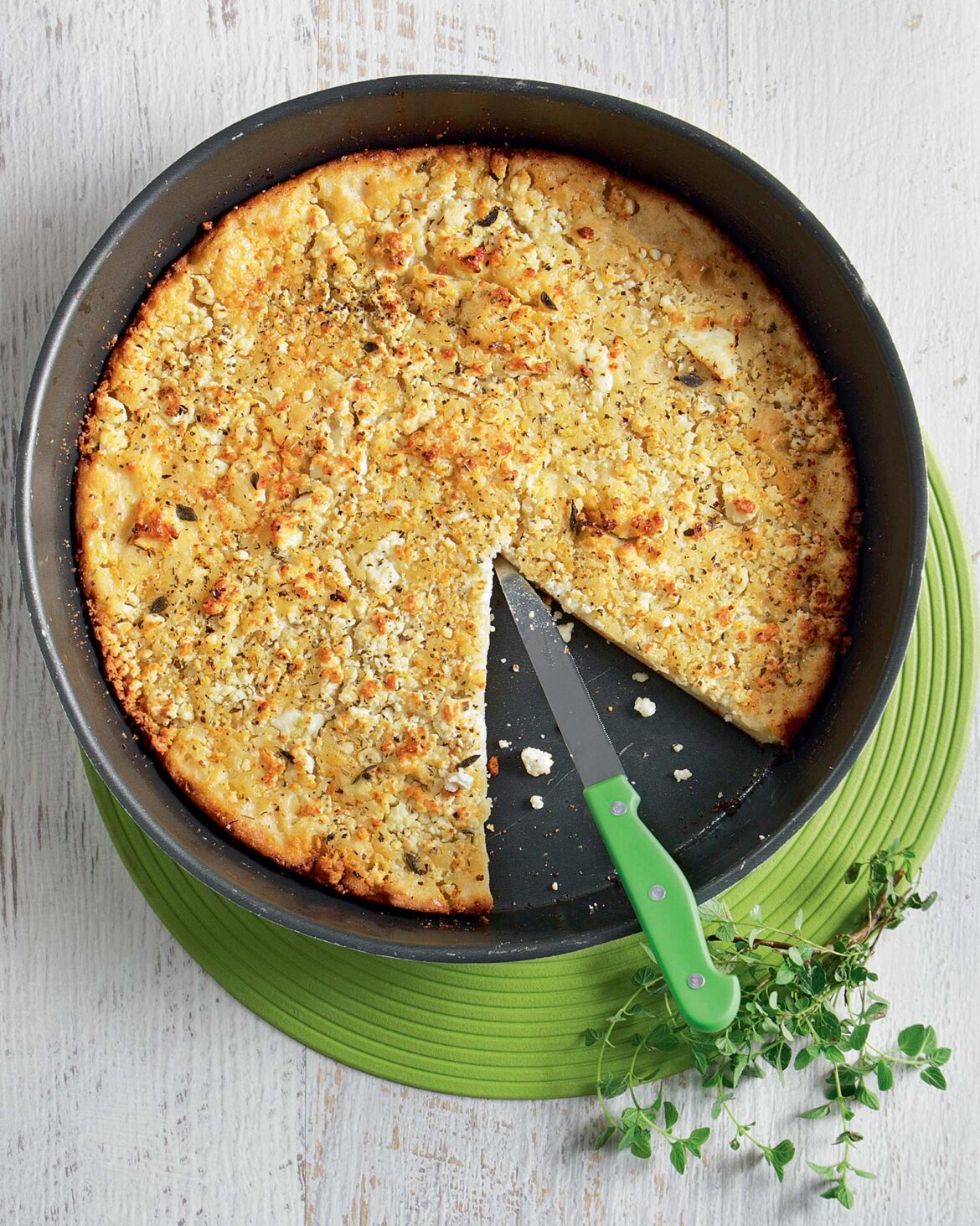 - Ρίχνουμε σε όλη την επιφάνειά του τη φέτα.