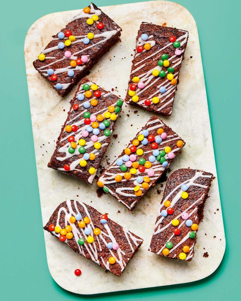 Ξεφουρνίζουμε το κέικ και μόλις κρυώσει, το αλείφουμε με γλάσο της αρεσκείας μας ή διακοσμούμε με smarties.