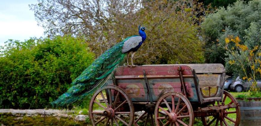 Επιβλητικό και αγέρωχο στέκει πάνω στο κάρο ενώ η εναλλαγή των χρωμάτων στο σώμα του μας αφήνει μία εικόνα ξεχωριστή ατο Κτήμα Μερκούρη στο Κορακοχώρι Ηλείας…