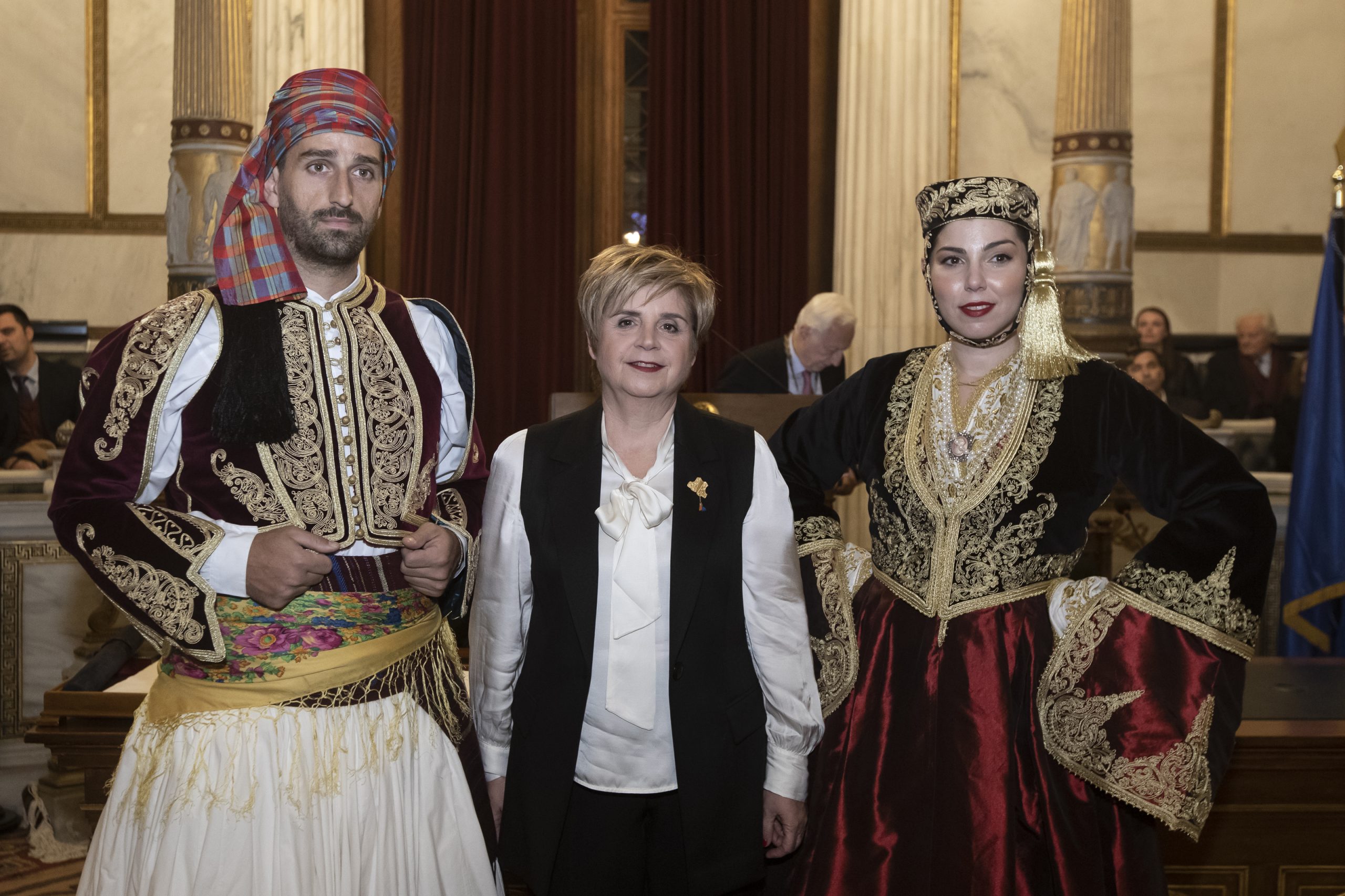 μέλη της χορευτικής ομάδας τον Ανδρέα Μικελόπουλο και τη Θεοδώρα Διαμαντοπούλου με φορεσιές «φουστανέλα» και «Αμαλία» αντίστοιχα, οι οποίοι με την παρουσία τους δημιούργησαν ένα μεγαλοπρεπές σκηνικό κατά την ώρα της βράβευσης αντάξιο του έργου και της δράσης του Λυκείου του Πύργου.