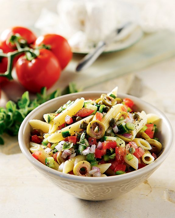 Βράζουμε τα ζυμαρικά σε μπόλικο, αλατισμένο νερό. Τα στραγγίζουμε, τα ανακατεύουμε με την πάστα ελιάς, το υπόλοιπο ελαιόλαδο και τα αφήνουμε να κρυώσουν.