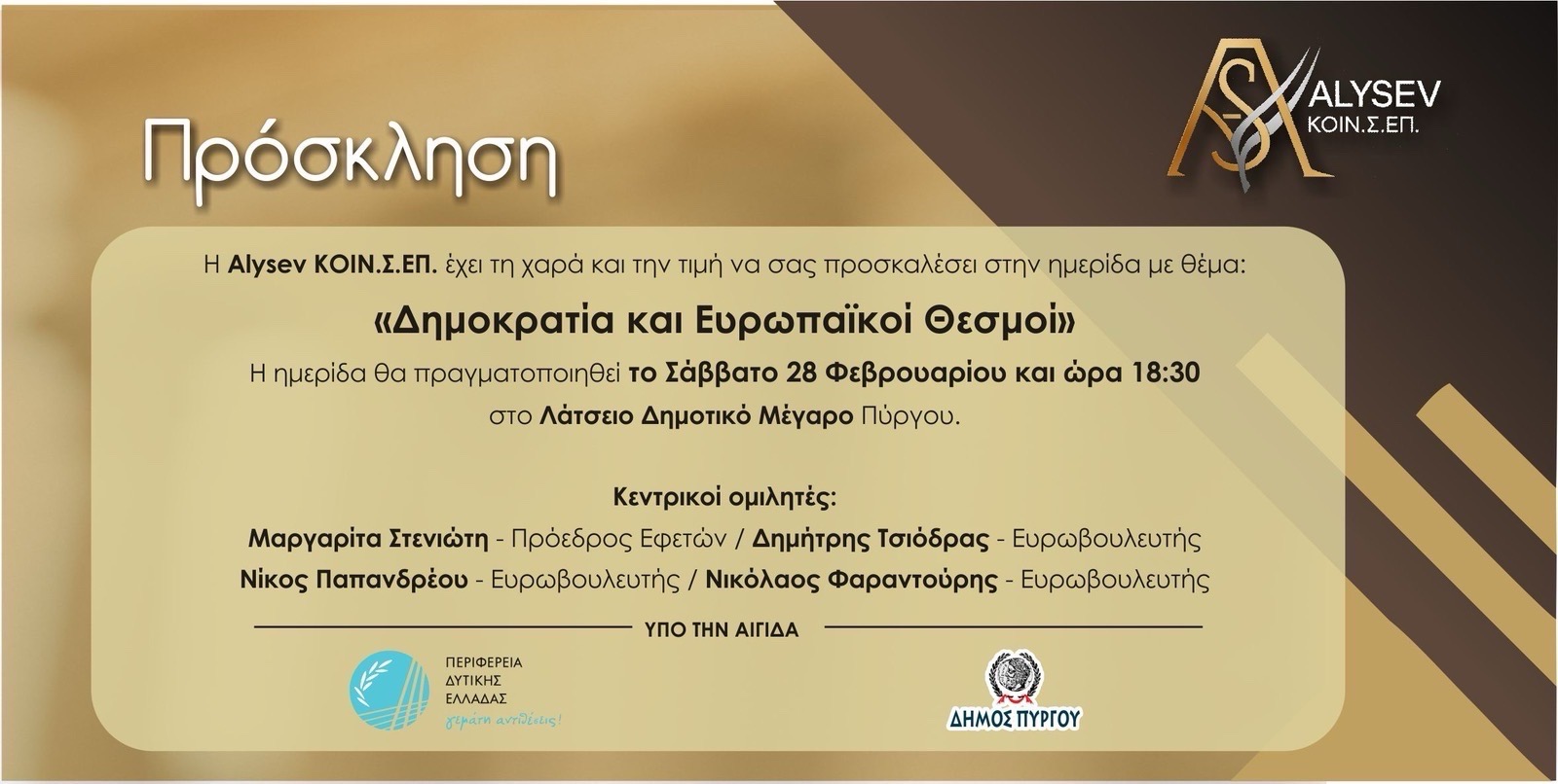 Η εκδήλωση διοργανώνεται από την ALYSEV, νεοσύστατη Κοινωνική Συνεταιριστική Επιχείρηση με έδρα τον Πύργο, που δραστηριοποιείται στον σχεδιασμό, την οργάνωση και την υλοποίηση συνεδρίων, ημερίδων και εκδηλώσεων κοινωφελούς χαρακτήρα, με επίκεντρο τον άνθρωπο, την κοινωνία και τη βιώσιμη ανάπτυξη.