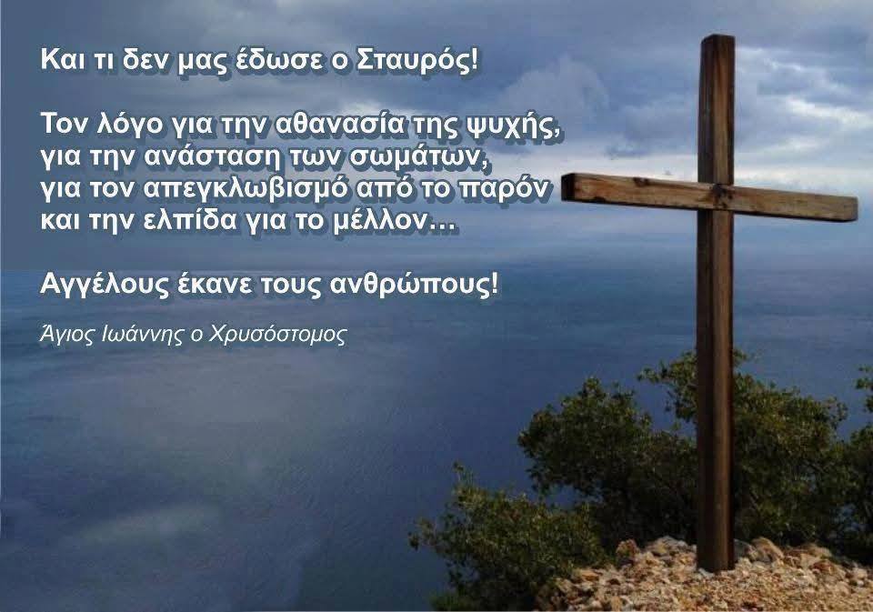 Εμείς έκτοτε το Ξύλο του Σταυρού όχι απλώς το προσκυνάμε και το τιμούμε, αλλά το λατρεύουμε, το λιτανεύουμε, το ασπαζόμαστε… Έγινε για όλους μας το «Ξύλο της Ζωής», το «Τρισμακάριστο και πανσεβάσμιο ξύλο», το «Τρόπαιο» και το «όπλο» κατά των δαιμόνων. Αυτόν, τον πανάγιο του Χριστού Σταυρό, «αοράτως» περικυκλώνουν οι Ασώματες Δυνάμεις κι όλοι εμείς οι πιστοί σε Αυτόν καταφεύγουμε, γιατί αποτελεί «της Οικουμένης φύλαξ» και «της Εκκλησίας η δόξα!».