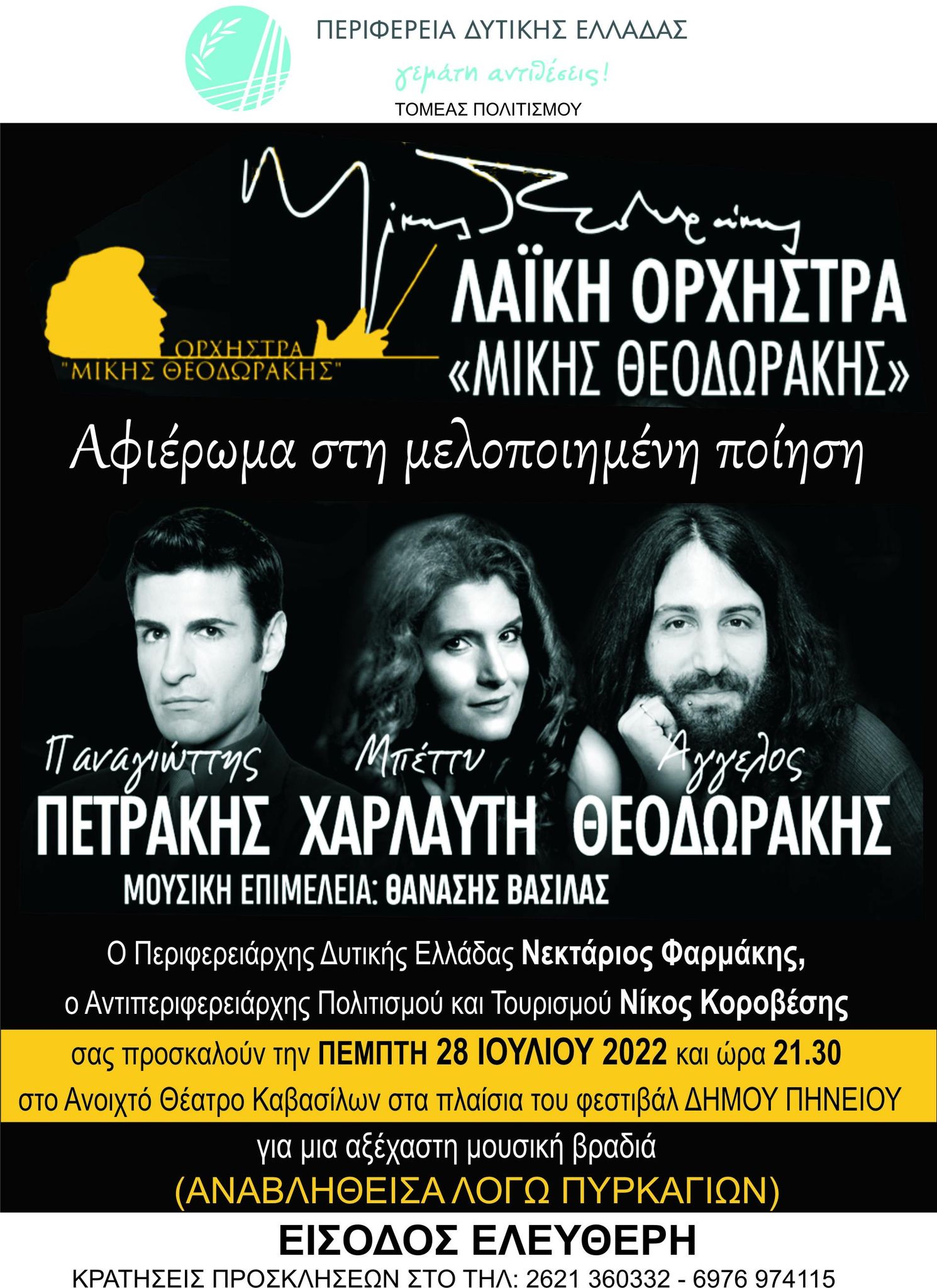 Ο Παναγιώτης Πετράκης, η Μπέτυ Καρλαύτη και ο Άγγελος Θεοδωράκης, θα παρουσιάσουν μαζί με την Λαϊκή Ορχήστρα “Μίκης Θεοδωράκης” ένα πρόγραμμα αφιερωμένο στα πιο αγαπημένα και γνωστά λαϊκά αλλά και λυρικά τραγούδια του συνθέτη. Είναι γνωστός ότι ο μουσικός κόσμος του Μίκη Θεοδωράκη ήταν άρρηκτα δεμένος με την ποίηση. Ο ίδιος είχε επανειλημμένα δηλώσει πως με τη μουσική του επιδίωκε πάντα να υπηρετεί τον ποιητικό λόγο.