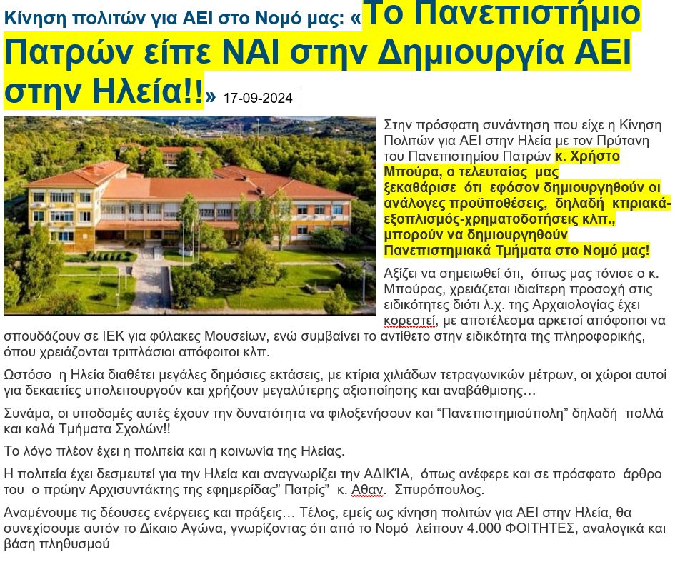 … Ή μας δουλεύει ο Πρύτανης (…ή η Κίνηση έχει πάθει σύγχυση.. ) … «Το Πανεπιστήμιο Πατρών είπε ΝΑΙ στην Δημιουργία ΑΕΙ στην Ηλεία!!»