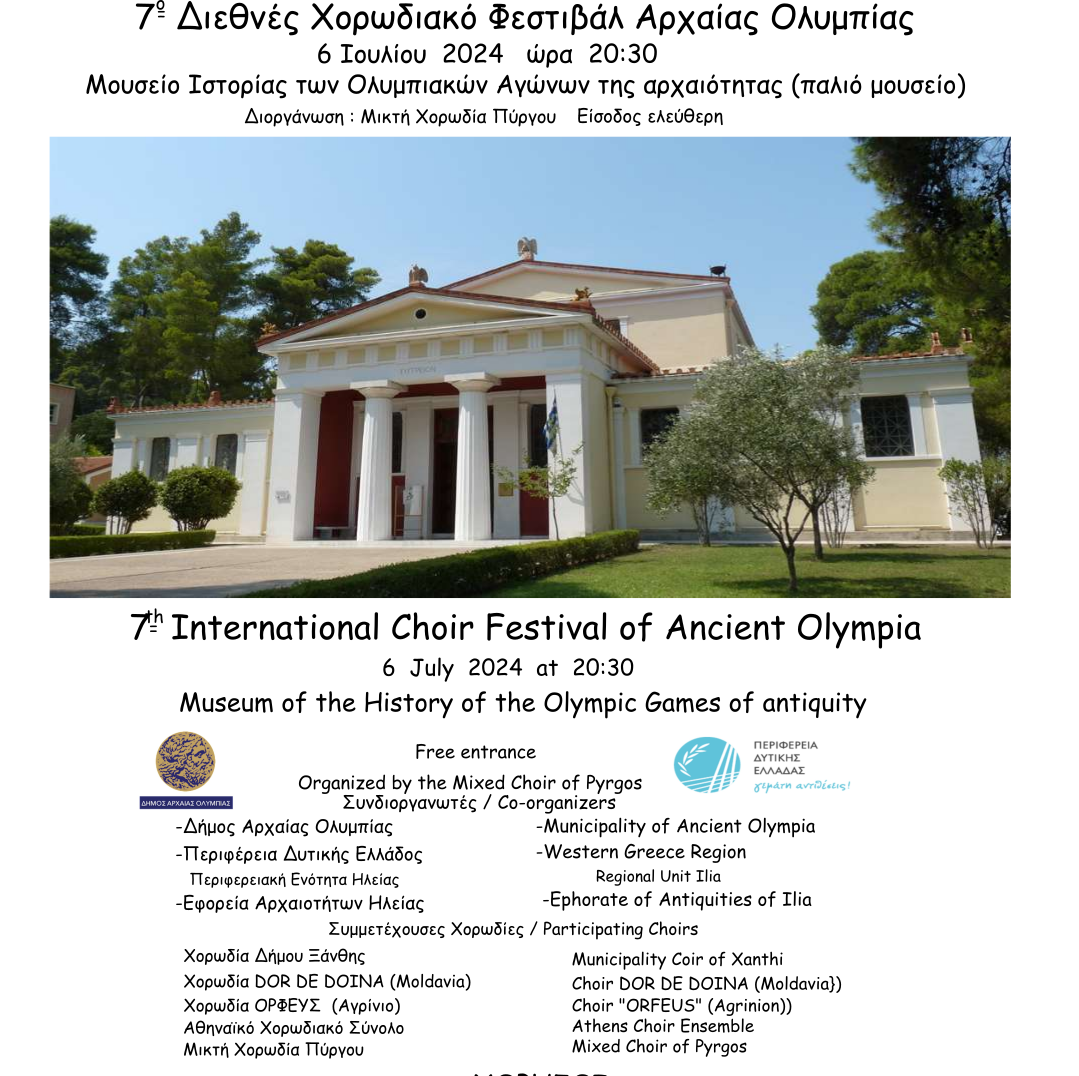 Η Μικτή Χορωδία Πύργου διοργανώνει το  7ο  Διεθνές Χορωδιακό Φεστιβάλ Αρχαίας Ολυμπίας  στον   αύλειο  χώρο του Μουσείου των Ολυμπιακών Αγώνων της Αρχαιότητας  στην Αρχαία Ολυμπία.