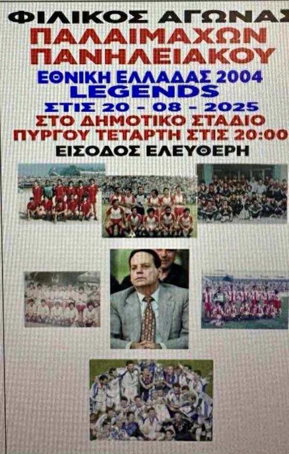 – «Η ώρα του Ηγέτη. Η ώρα του Προέδρου μας. Στις 20 Αυγούστου και ώρα 8.00μ.μ. στο γήπεδο «Μαρακανά» δίνουμε το «παρών» για να τιμήσουμε τον άνθρωπο που μας καθιέρωσε στις συνειδήσεις του Έλληνα φιλάθλου. Σε περιμένουμε με την παρουσία σου να χειροκροτήσουμε και να φωνάξουμε “ΠΑΝΗΛΕΙΑΚΟΣ” όλοι μαζί και ο ήχος να ακουστεί σε όλο το …σύμπαν. Φιλικός αγώνας Πανηλειακός Vs Εθνική 2004».
