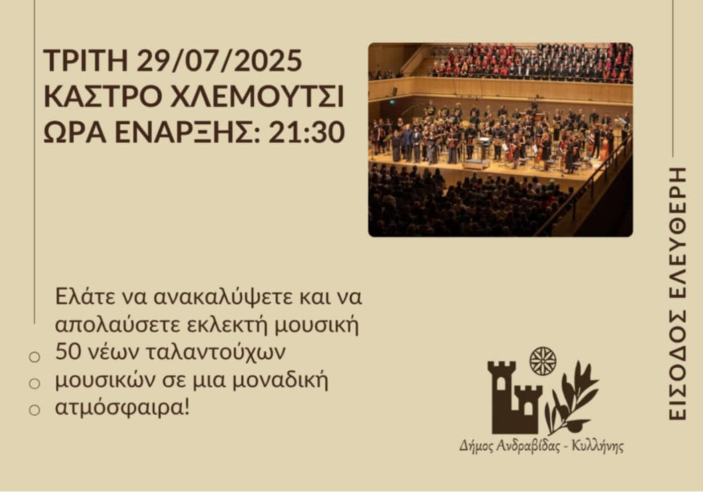 Το 14ο Διεθνές Φεστιβάλ Ανδραβίδας-Κυλλήνης συνεχίζει το πολιτιστικό του ταξίδι. Η Συμφωνική Ορχήστρα Νέων Ζυρίχης, που αποτελεί μία από τις σπουδαιότερες και πλέον προβεβλημένες ορχήστρες νέων μουσικών του πλανήτη, εμφανίζεται στο επιβλητικό Κάστρο Χλεμούτσι, την Τρίτη 29 Ιουλίου και ώρα 21:00. Η είσοδος είναι δωρεάν για το κοινό.