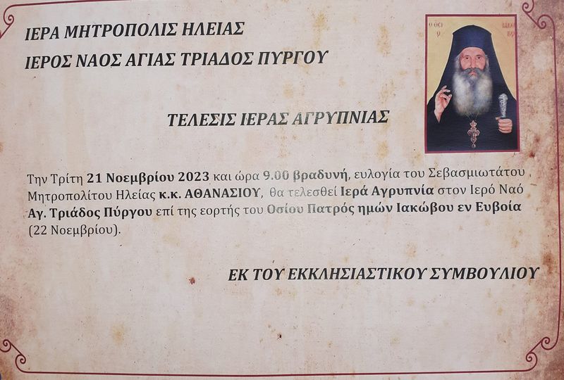 Την Τρίτη 21 Νοεμβρίου 2023 στις 9.00 το βράδυ θα τελεσθεί Ιερά Αγρυπνία στον Ιερό Ναό Αγ. Τριάδος Πύργου, με τις ευλογίες του Σεβ. Μητροπολίτου Ηλείας κ.κ. ΑΘΑΝΑΣΙΟΥ επί την εορτή του του Οσίου Πατρός ημών Ιακώβου του εν Ευβοία (22 Νοεμβρίου).