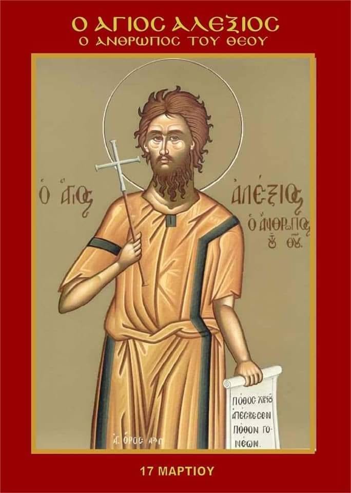 Αγαπητοί μας φίλοι και Χριστιανοί μας ευλογημένοι, στις 17 Μαρτίου κάθε χρόνο μέσα στην Αγία και Μεγάλη Τεσσαρακοστή η Ορθόδοξη Εκκλησία μας, εορτάζει την Ιερή μνήμη του οσίου Αλεξίου, του ανθρώπου του Θεού και τιμά έτσι ένα σπάνιο στολίδι στη χορεία των Αγίων της! Αν πραγματικά θέλουμε να γίνουμε άνθρωποι του Θεού, τότε οπωσδήποτε θα πρέπει να γνωρίσουμε το θαυμαστό βίο, εκείνου που η επίγεια βιωτή του, του εξασφάλισε κατά Θεϊκή επιταγή την Θεόκλητη προσωνυμία: «Ο Άνθρωπος του Θεού», αφού η Υπεραγία Θεοτόκος και ο ίδιος ο Κύριος με τη φωνή Του, τον αποκάλυψε, τον ονόμασε και τον υπέδειξε στον Χριστιανικό λαό της Ρώμης.