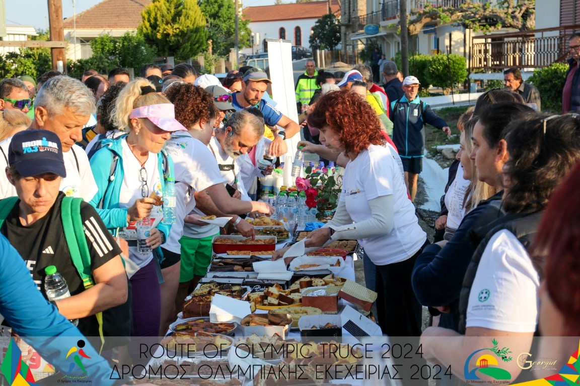 Σε όλα τα χωριά της διαδρομής οι δρομείς έτυχαν της καλύτερης δυνατής φιλοξενίας από τους κατοίκους- εθελοντές του Δρόμου της Εκεχειρίας για ακόμη μία φορά, οι οποίοι προσέφεραν κι εφέτος τοπικά εδέσματα θέλοντας να δείξουν ότι η φιλοσοφία του «Ξένιου Δία», εξακολουθεί να υπάρχει στον τόπο που γέννησε τους Ολυμπιακούς Αγώνες.