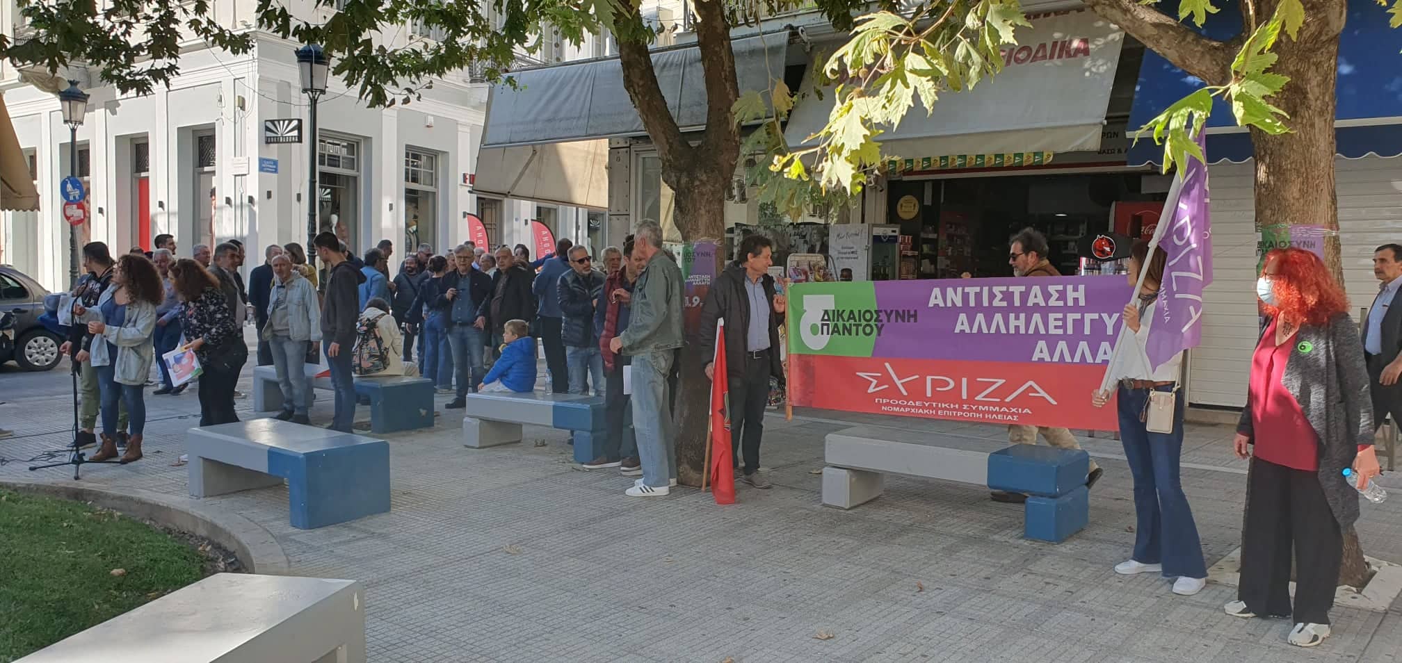 Σε κλιμάκωση της πάλης το επόμενο διάστημα κάλεσε στην κεντρική του ομιλία ο πρόεδρος του Σωματείου Εργαζομένων στις Ιδιωτικές και Εμπορικές Επιχειρήσεις, Νίκος Γκότσης, ενώ χαιρετισμούς απεύθυναν οι Χρήστος Γαρύφαλλος πρόεδρος του σωματείου εργαζομένων Δήμων Πύργου – Ζαχάρως – Αρχαίας Ολυμπίας, Νίκος Λοχοβήτης πρόεδρος εργαζομένων ΕΔΟΠ – ΔΕΗ, Κώστας Γιάνναρος πρόεδρος συνδικάτου Οικοδόμων Ηλείας, Στέλλα Αναστασίου, πρόεδρος ΕΛΜΕ, Δημήτρης Μικέλης, αντιπρόεδρος εργαζομένων Αποκεντρωμένης Διοίκησης και Βασιλική Λυμπεροπούλου, εκ μέρους της συντονιστικής επιτροπής των μαθητών.