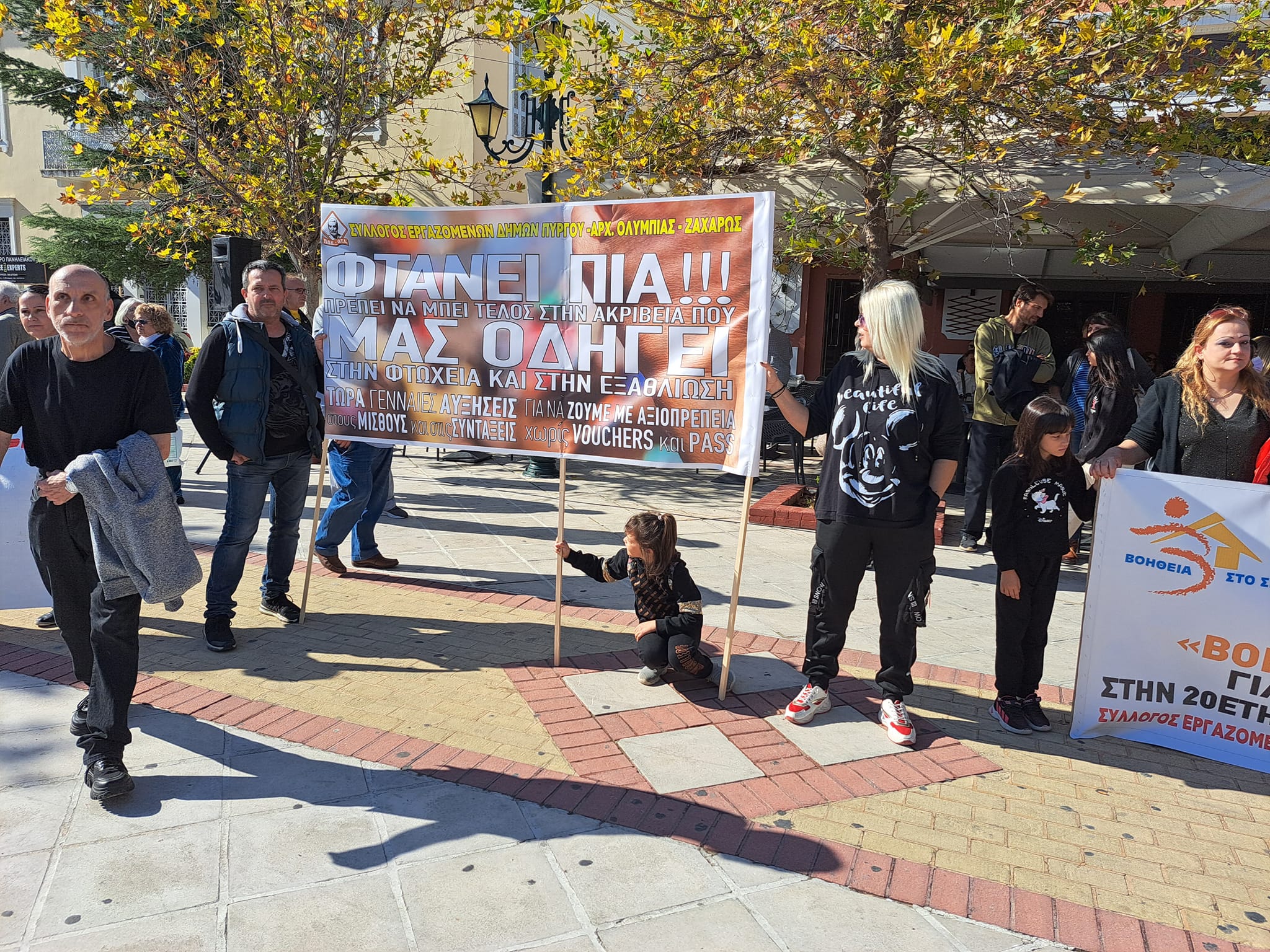 Στην συγκέντρωση των σωματείων στον Πύργο, το δικό τους δυναμικό «παρών» έδωσαν και απεργοί εργαζόμενοι απ’ την μονάδα επεξεργασίας απορριμάτων της Τριανταφυλλιάς Ηλείας, ενώ συμμετείχαν επίσης, αγρότες, γυναίκες λαϊκών οικογενειών αλλά και νεολαία με μπροστάρηδες τους μαθητές. «Τρόφιμα και ρεύμα φθηνά για το λαό, συλλογικές συμβάσεις αυξήσεις στο μισθό», διεκδίκησαν μεταξύ άλλων και με αναφορές στα πανό τους τα σωματεία, με τους μαθητές να απαιτούν «σχολείο που να μορφώνει, όχι να εξοντώνει».
