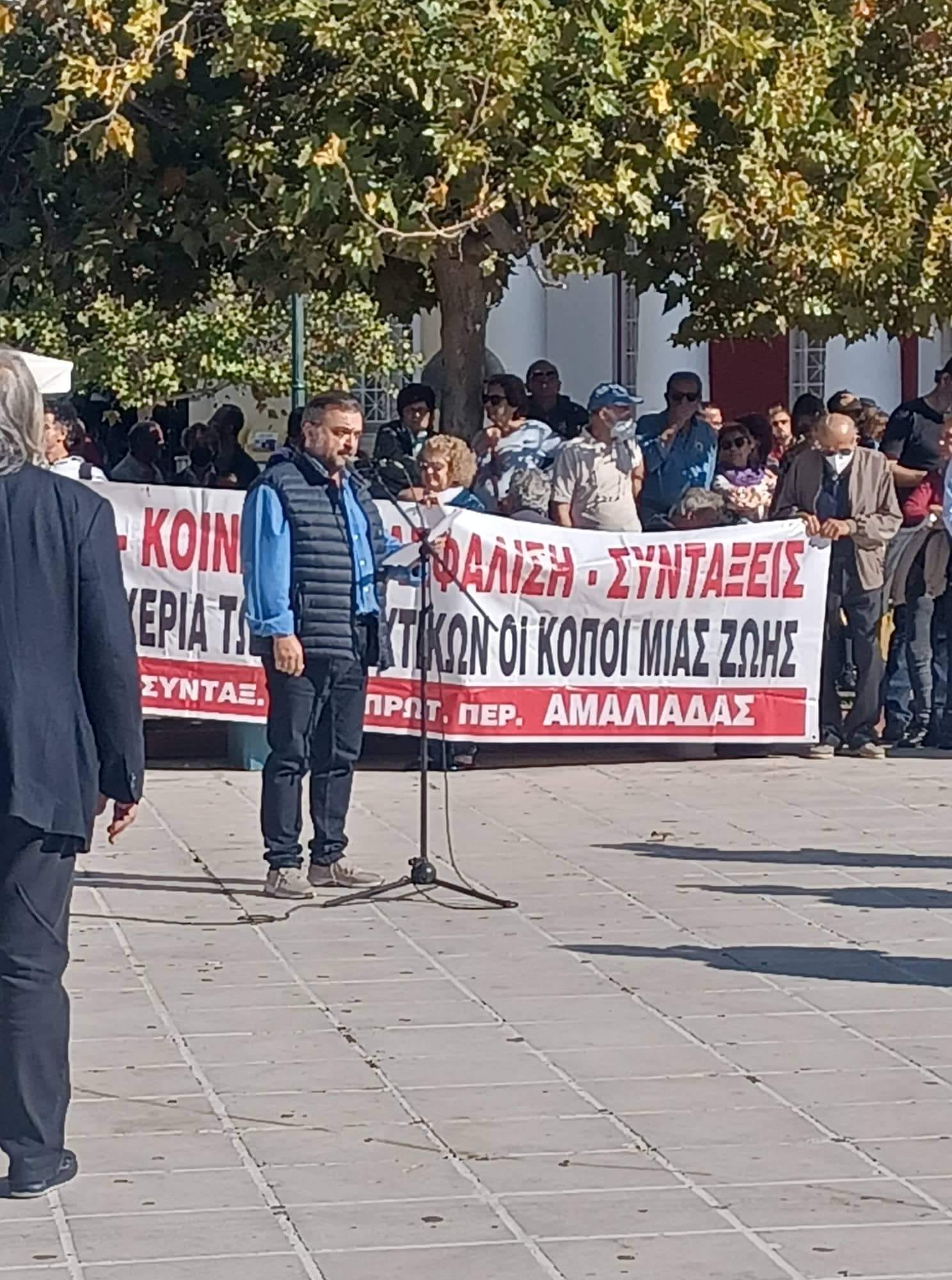 Αντίστοιχα συγκέντρωση νωρίτερα το πρωί, πραγματοποιήθηκε και στην Αμαλιάδα, με τη συμμετοχή εργαζομένων από διάφορους χώρους, όπως επίσης και οι σύλλογοι εμπόρων και δικηγόρων, οι πρόεδροι των οποίων χαιρέτισαν τους συγκεντρωμένους. Στην κεντρική της ομιλία, η Νατάσα Παναγιωτάρα, πρόεδρος του ΕΚ Αμαλιάδας, κάλεσε σε συνέχεια των αγώνων και το επόμενο διάστημα με τους εργατοϋπαλλήλους και το λαό μπροστά, στην πρώτη γραμμή.