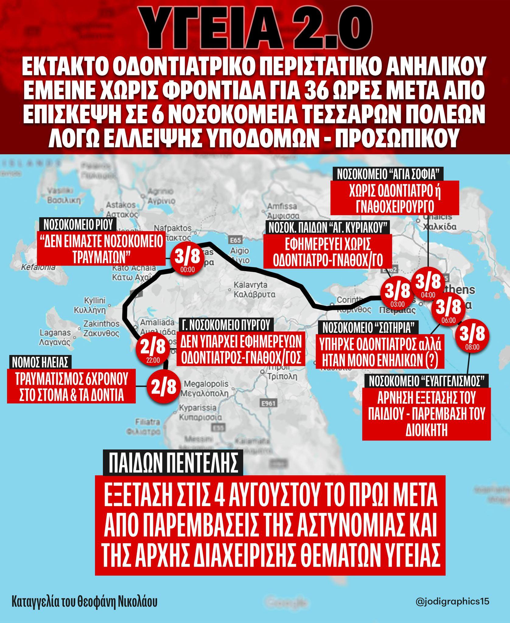 “Το Σάββατο 2 Αυγούστου, βρισκόμουν οικογενειακώς στον Νομό Ηλείας. Ο γιος μου, ηλικίας έξι ετών, είχε ένα σοβαρό ατύχημα – τραυματίστηκε στο στόμα και τα δόντια του μετακινήθηκαν επικίνδυνα. Πήγαμε αμέσως στο Γενικό Νοσοκομείο Πύργου, την πρωτεύουσα του νομού. Εκεί, οι γιατροί μας πληροφόρησαν ότι δεν υπήρχε εφημερεύων ούτε οδοντίατρος, ούτε γναθοχειρουργός.