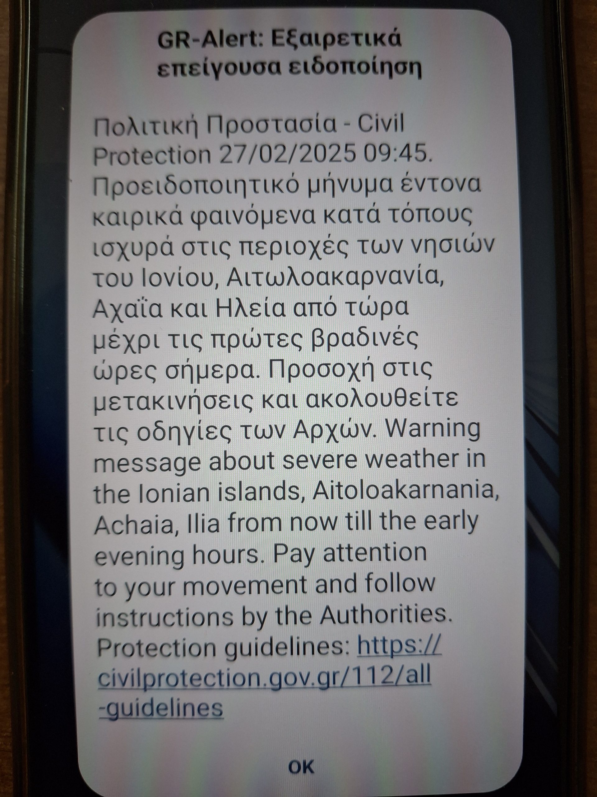 Το 112 ήχησε λίγο πριν από τις 10 το πρωί της Πέμπτης και καλεί τους πολίτες να περιορίσουν τις μετακινήσεις και να ακολουθούν τις οδηγίες των Αρχών.