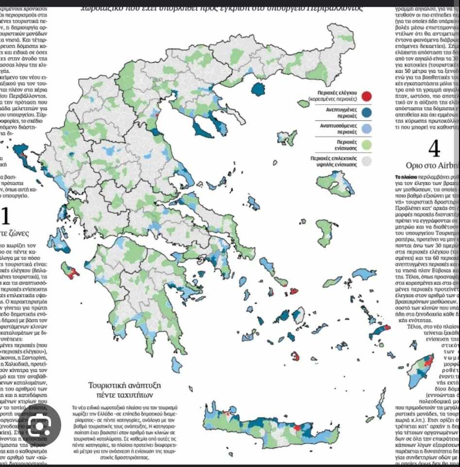• Στις κορεσμένες περιοχές (που ονομάζονται «περιοχές ελέγχου»), όπως λ.χ. η Μύκονος και η Σαντορίνη (αλλά και οι Δημοτικές Ενότητες Χανίων και Πλατανιά, σύμφωνα, τουλάχιστον, με τον χάρτη που δημοσιεύει στο σημερινό πρωτοσέλιδο ρεπορτάζ τού Γιώργου Λιάλιου η εφημερίδα «Καθημερινή»), προτείνεται να δοθούν κίνητρα για τον εκσυγχρονισμό και την αναβάθμιση υφιστάμενων καταλυμάτων, χωρίς αύξηση του αριθμού των κλινών (ακόμα και η κατεδάφιση εγκαταλελειμμένων κτηρίων που προσβάλλουν το τοπίο). Επίσης, για τη μετατροπή υφιστάμενων μονάδων σε «οργανωμένους υποδοχείς» (λ.χ. ξενοδοχείο με τουριστικές κατοικίες). Στις περιοχές αυτές προτείνεται η εκπόνηση μελετών εκτίμησης της φέρουσας ικανότητας και ο καθορισμός «οροφής» στον αριθμό των «χώρων τουρισμού διαμοιρασμού» (βραχυχρόνιες μισθώσεις τύπου Airbnb – όπως αναφέρθηκε παραπάνω) και στα ενοικιαζόμενα δωμάτια, ως ποσοστό των κλινών των ξενοδοχείων. Μέχρι την ολοκλήρωση του πολεοδομικού σχεδιασμού, στις περιοχές αυτές προτείνεται η αύξηση της ελάχιστης αρτιότητας στα 16 στρέμματα και η κατασκευή μόνο καταλυμάτων 4 και 5 αστέρων. Δεν προτείνεται κάποια άλλη απαγόρευση στην ανέγερση νέων τουριστικών μονάδων.