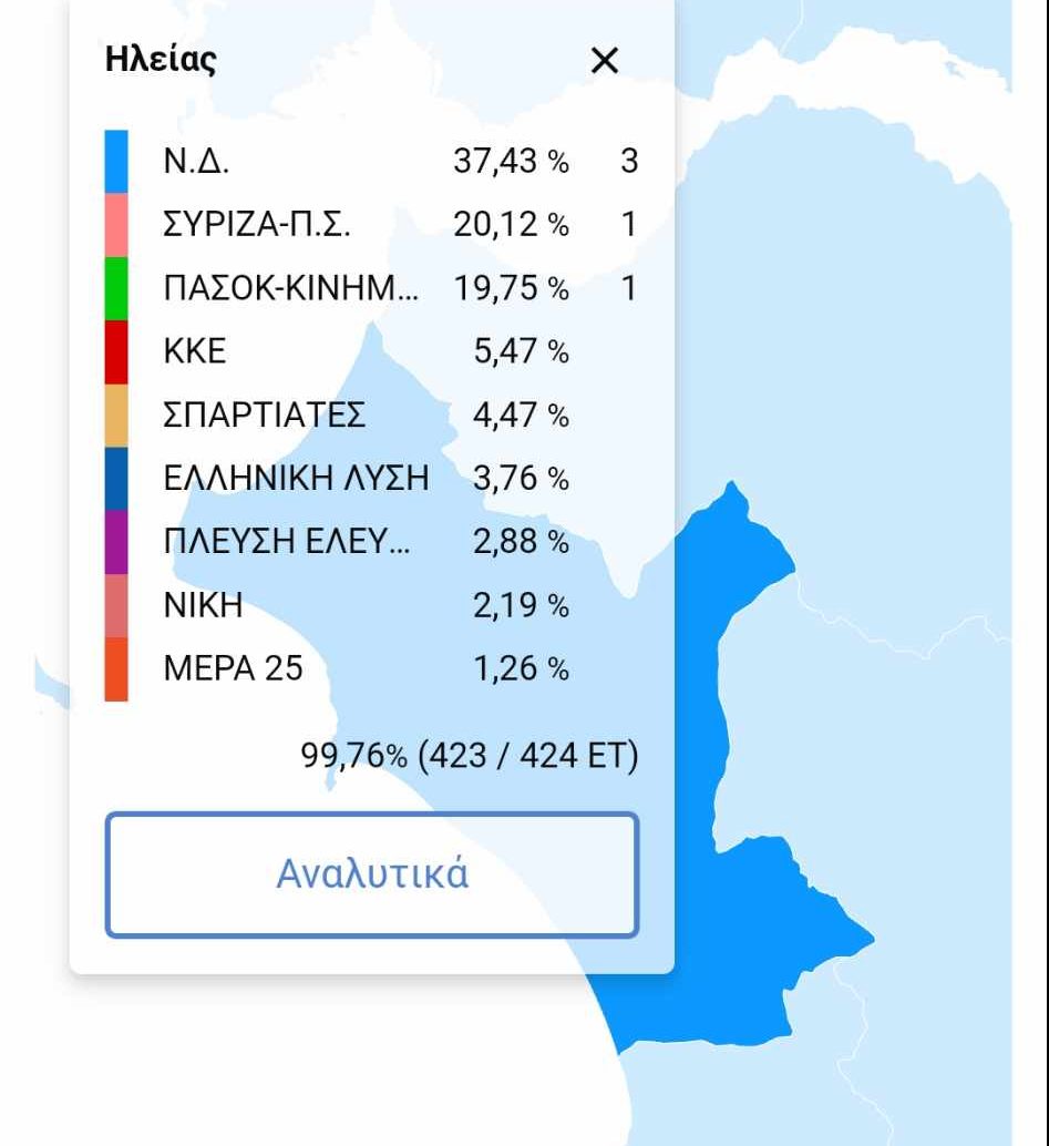 Δήμος Ηλιδας: ΝΔ 33,76%, ΣΥΡΙΖΑ 21,09% , ΠΑΣΟΚ 23,10% , ΚΚΕ 5,88% , ΣΠΑΡΤΙΑΤΕΣ 4,32%, ΕΛΛΗΝΙΚΗ ΛΥΣΗ 4,05%.