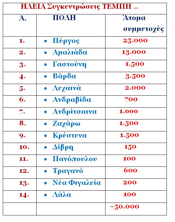 ΗΛΕΙΑ: Πόσοι συμμετείχαν ανά πόλη στις συγκεντρώσεις διαμαρτυρίας για τα ΤΕΜΠΗ