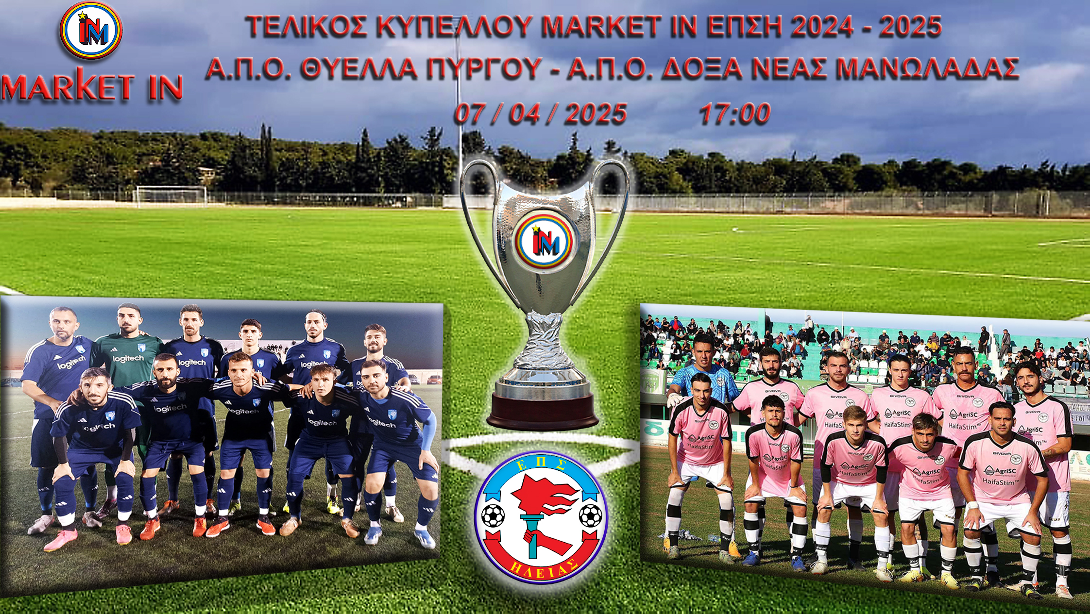Ο τελικός Κυπέλλου Ηλείας MARKET IN 2024-2025 όπου θα αγωνιστούν η Θύελλα Πύργου και η Δόξα Νέας Μανωλάδας, θα διεξαχθεί τη Δευτέρα 7 Απριλίου.