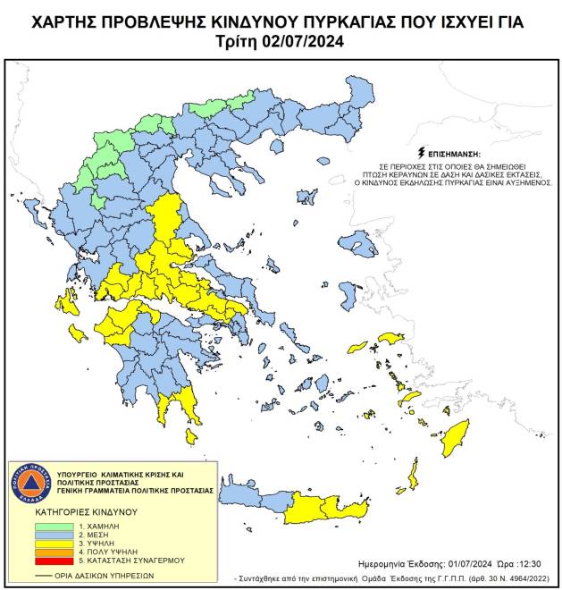 Υψηλός κίνδυνος πυρκαγιάς (κατηγορία κινδύνου 3) προβλέπεται σήμερα Τρίτη 2 Ιουλίου, σύμφωνα με το Χάρτη Πρόβλεψης Κινδύνου Πυρκαγιάς που εκδίδει η Γενική Γραμματεία Πολιτικής Προστασίας του υπουργείου Κλιματικής Κρίσης και Πολιτικής Προστασίας.