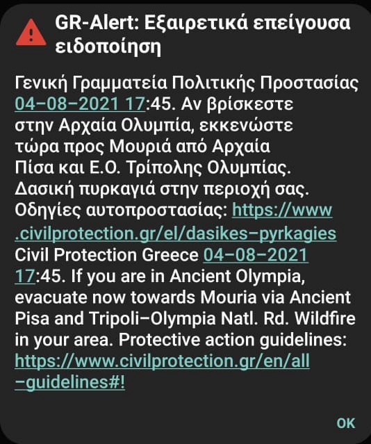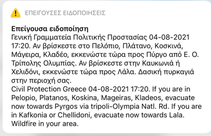 «Αν βρίσκεστε στο Πελόπιο, Πλάτανο, Κοσκινά, Μάγειρα και Κλαδέο, εκκενώστε τώρα προς Πύργο από Εθνική Οδό Τρίπολης-Ολυμπίας. Αν βρίσκεστε, στην Καυκωνιά ή Χελιδόνι, εκκενώστε τώρα προς Λάλα. Δασική πυρκαγιά στην περιοχή σας», αναφέρει χαρακτηριστικά.