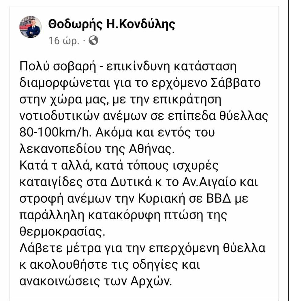 Για άσχημο καιρό το Σαββατοκύριακο ενημερώνει μέσω ανάρτησης ο μετεωρολόγος από την Ηλεία Θοδωρής Κονδύλης και κρούει τον κώδωνα του κινδύνου για τους πολύ ισχυρούς ανέμους που θα πνέουν ειδικά το Σάββατο. Μάλιστα κάνει λόγο για ανέμους-θύελλας που θα έχουν ισχύ 80-100χλμ την ώρα.