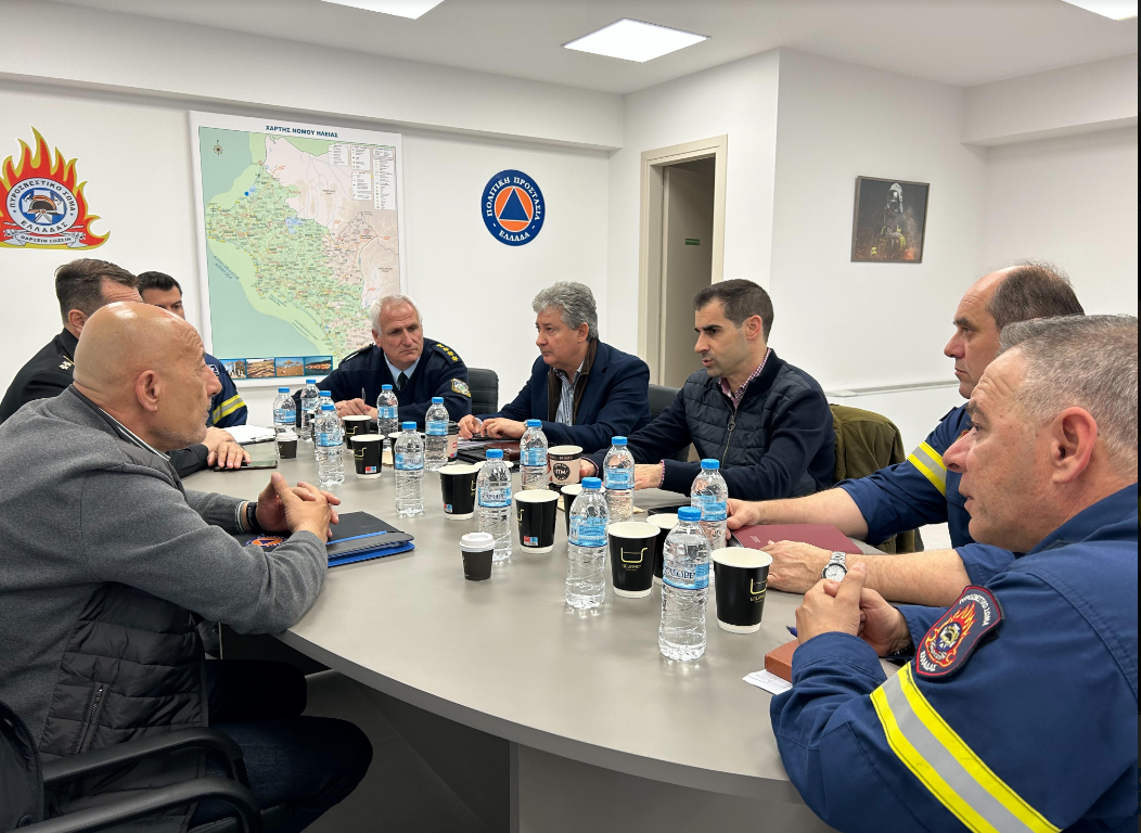 Σύσκεψη για την καλύτερη θωράκιση ενόψει αντιπυρικής περιόδου, από τον υπουργό Κλιματικής Κρίσης και Πολιτικής Προστασίας Χρ. Στυλιανίδη με τη συμμετοχή του Αντιπεριφερειάρχη Ηλείας, Β. Γιαννόπουλου.