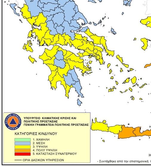 Πολύ υψηλός κίνδυνος εκδήλωσης πυρκαγιάς (κατηγορία 4) προβλέπεται για σήμερα Τετάρτη, σύμφωνα με τον Χάρτη Πρόβλεψης Κινδύνου Πυρκαγιάς που εκδίδει η Γενική Γραμματεία Πολιτικής Προστασίας, για τις εξής περιοχές, ενώ στην κατηγορία 3 βρίσκεται η Δυτ. Ελλάδα με την Ηλεία να είναι σε επιφυλακή εδώ και ημέρες.