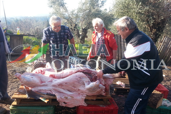 Πήρε 30 κιλά λίπος από χοιρινό, και 15 με 20 κιλά κρέας. Έβαλε της φέτες του λίπους σε μεγάλα τελάρα και το αλάτισε στρώσεις στρώσεις.