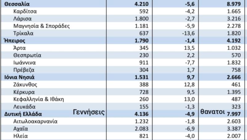 Στην Ηλεία τα στοιχεία δείχνουν την σκληρή πραγματικότητα της μεγάλης μείωσης του πληθυσμού. Πέραν των όσων έχουν φύγει για άλλες περιοχές ή το εξωτερικό λόγω αναζήτησης εργασίας, υπάρχει ένα τεράστιο κενό λόγω θανάτων που δεν αναπληρώνεται με γεννήσεις. Τα στοιχεία δείχνουν το μέλλον που είναι πολύ σκοτεινό καθώς αν δεν υπάρχουν γεννήσεις και πληθυσμός τότε θα επέλθει η ερημοποίηση.