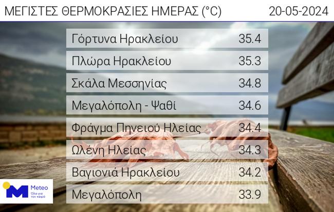 Σύμφωνα με το meteo.gr και τις καταγραφές που έδειξαν τα όργανα, η θερμοκρασία για χτες Δευτέρα χτύπησε κόκκινο σε Πελοπόννησο και Κρήτη με την Ηλεία να έχει καταγεγραμμένες δύο περιοχές που η θερμοκρασία ξεπέρασε τους 34 βαθμούς.