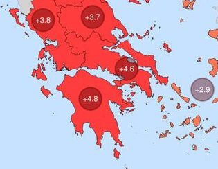 Ο χάρτης δείχνει τις αποκλίσεις της μέσης μέγιστης θερμοκρασίας τον Ιούνιο 2024 ανά γεωγραφικό διαμέρισμα.