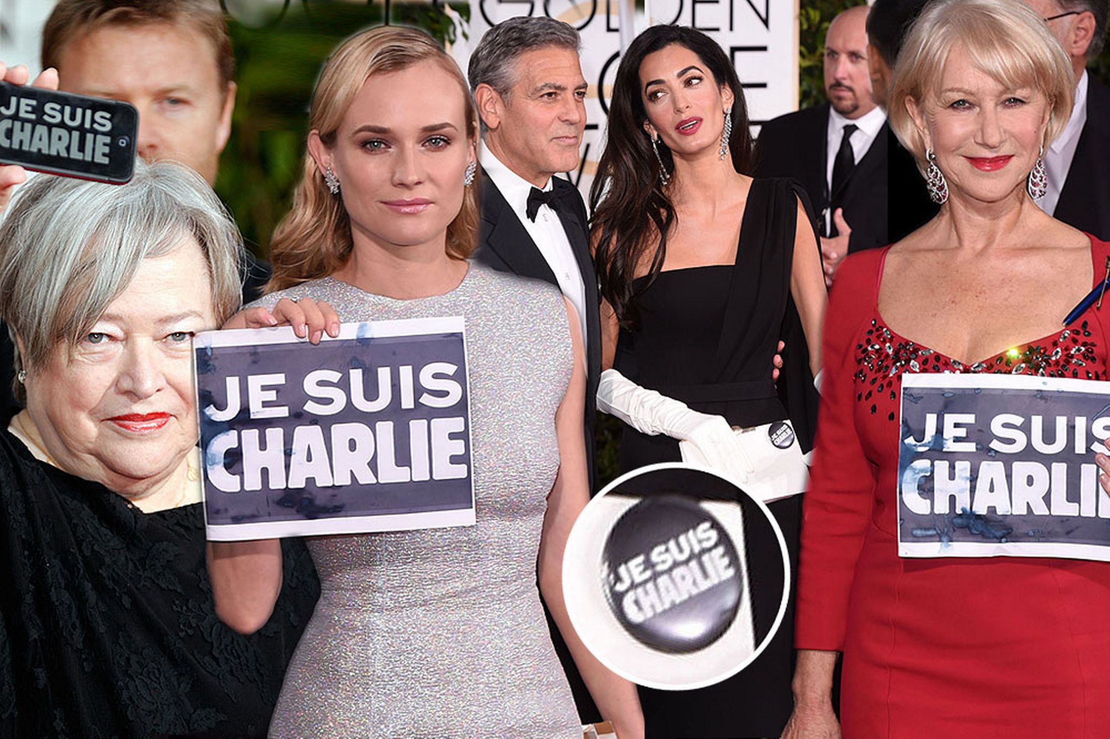 Ο Τζορτζ Κλούνεϊ συνοδευόμενος από τη σύζυγό του Αμάλ Αλαμουντίν είχε καρφιτσωμένη μια κονκάρδα με την επιγραφή «Je Suis Charlie», ενώ η Έλεν Μίρεν είχε τοποθετήσει μια μαύρη πένα στο αριστερό τμήμα του κόκκινου φορέματός της.