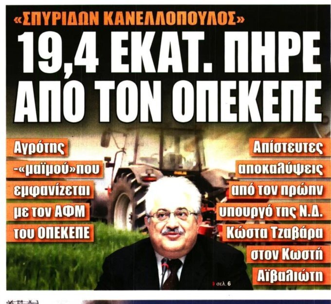 Το θέμα του μυστηριώδους ΑΦΜ με το όνομα Σπυρίδων Κανελλόπουλος από την Ηλεία στο οποίο φέρεται να έχει πιστωθεί το θηριώδες ποσό των 19.463.554 ευρώ και που έχει δει πλέον κατ’ επανάληψη το φως της δημοσιότητας, στο πλαίσιο του τεράστιου σκανδάλου των παράνομων επιδοτήσεων από τον ΟΠΕΚΕΠΕ, επανήλθε στην επικαιρότητα κατόπιν σχετικών δηλώσεων του πρ. υπουργού και βουλευτή Κώστα Τζαβάρα στην εφημερίδα ONE VOICE. Ο Ηλείος πρώην υπουργός μίλησε στην εκπομπή “Οξυγόνο” LIBERO 107,4 που διατηρεί ο πρ. βουλευτής της Β’ Άθηνών Κωστής Αιβαλιώτης, μεταφέροντας σε συνέχεια τη συζήτησή τους στην παραπάνω εφημερίδα. Ο κ. Τζαβάρας χαρακτήρισε τον συγκεκριμένο αγρότη, «αγρότη ζόμπι» ο οποίος δεν έχει βρεθεί – ή έχει αποβιώσει- και παρ όλα αυτά αποκάλυψε ότι στο ΑΦΜ του έχει πιστωθεί το παραπάνω ποσόν μαμούθ που αντιστοιχεί ούτε λίγο ούτε πολύ σε… 200.000 στρέμματα γης, σχεδόν όση είναι και η έκταση όλου του νομού Ηλείας, κάτι ανάλογο με τις επιδοτήσεις στην Κρήτη.