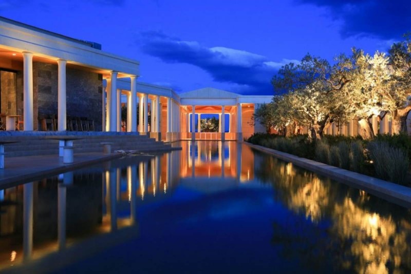 Ονομάζεται Amanzoe (από την σανσκριτική λέξη “aman” που σημαίνει “ειρηνικό” και την ελληνική λέξη “ζωή”) και θυμίζει αρχαιοελληνικό ανάκτορο.