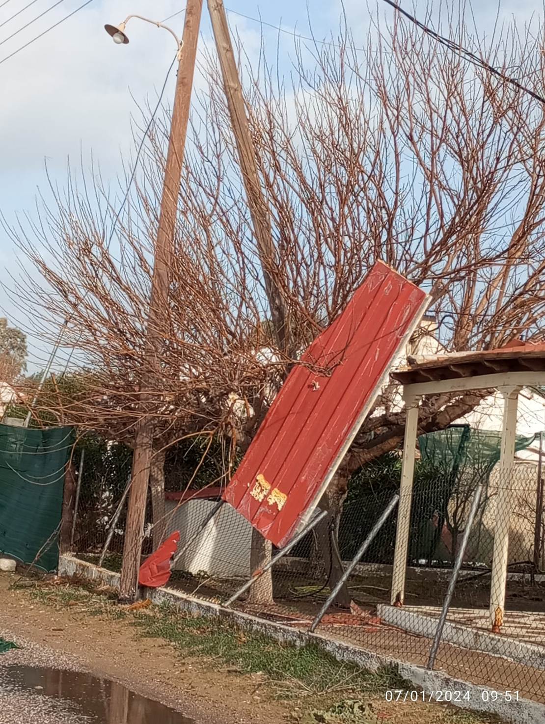 Σκεπές με κεραμίδια ξηλώθηκαν, αποθήκες σε επιχειρήσεις καταστράφηκαν, μαντριά διαλύθηκαν και δέντρα που έπεσαν εμποδίζοντας την κυκλοφορία είναι λίγα μόνο από όσα καταγράφηκαν ως ζημιές στην ευρύτερη περιοχή μας.